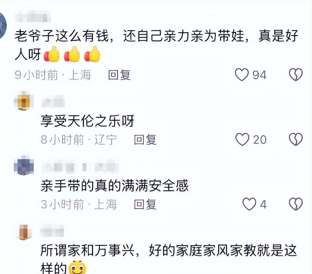 网友亦然批驳说念:老爷子这样有钱,还亲力亲为带娃,竟然好东说念主啊!底下网友说念:享受天伦之乐。所谓家和万事兴,好的家庭家风家教便是这样。